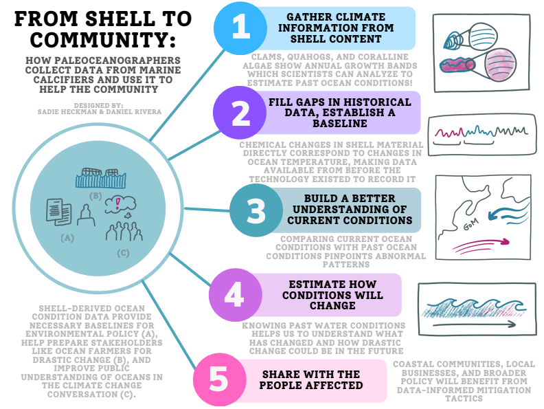 With funding from the NSF, we hosted a science communication fellowship program for undergraduate students in collaboration with CMC, Bowdoin College, Brown University, and Hamilton College. Participants attended a five-day workshop at the Bowdoin College Shiller Coastal Studies Center, where students learned about how the opinions of local stakeholders can intersect with science and inform environmental policy. Students presented original research and received mentorship in science communication skills from our Gulf of Maine research collaborators, including faculty from CMC, Bowdoin College, Hamilton College, Iowa State University, the University of Bristol, and Western Washington University. We visited and interviewed local stakeholders such as the Basin Oyster Project, Mook Sea Farms, and Wharfside Associates to further explore connections between our paleoceanographic research and industry. After hearing the opinions and needs of stakeholders, students created deliverables in the form of op-eds, policy memos, and infographics.